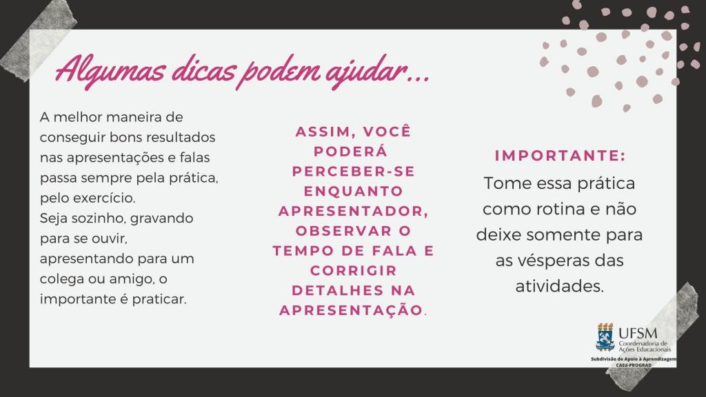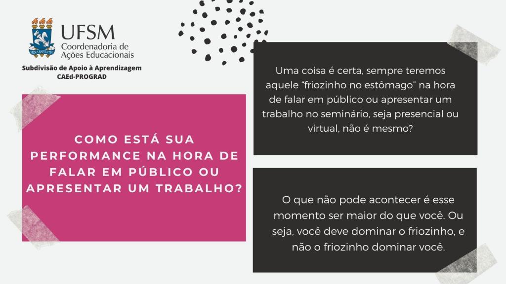 O final do semestre está chegando e você ainda tem dificuldades nas apresentações de trabalhos? Pensando nisso, a Subdivisão de Apoio à Aprendizagem (CAEd-PROGRAD) destacou alguns pontos que podem auxiliar a sua performance na hora de falar em público. Confira!