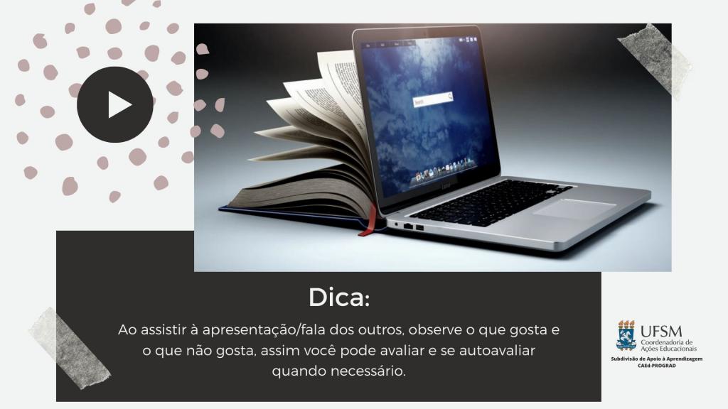 Legenda: Dica – Ao assistir à apresentação/fala dos outros, observe o que gosta e o que não gosta, assim você pode avaliar e se autoavaliar quando necessário.