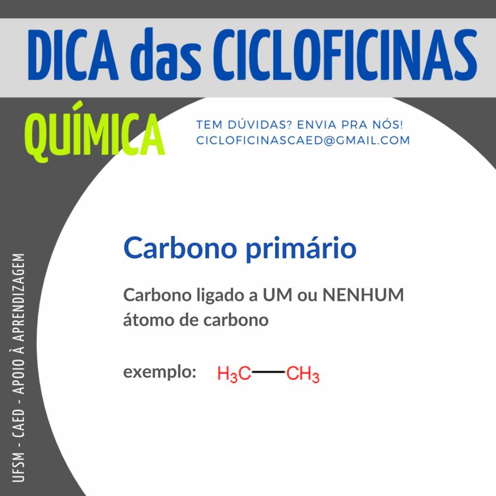 Descrição da imagem: Imagem horizontal e colorida em formato quadrado. Possui fundo na cor cinza. Na parte superior, retângulo na cor cinza com o texto: “Dica das Cicloficinas”, na cor azul. Abaixo, o texto: “Química”, na cor verde. Ao lado,  dentro de um círculo branco vazado para a parte direita da imagem e em fonte menor, o texto: Tem dúvidas? Envia pra nós! cicloficinascaed@gmail.com”, na cor azul. Abaixo, centralizado e em negrito, o texto: “Carbono primário”, na cor azul. Abaixo, “Carbono ligado a UM ou NENHUM átomo de carbono”, na cor cinza. Abaixo, “exemplo:, na cor cinza; H3C — CH3, na cor vermelha. Na lateral inferior esquerda da imagem, na vertical, em letras na cor branca há “UFSM – CAED – Apoio à aprendizagem”.