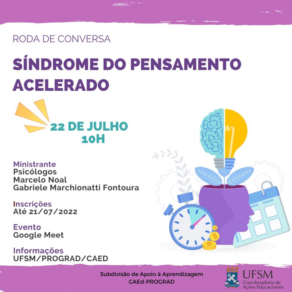 Descrição da imagem: Descrição da imagem: Imagem horizontal e colorida em formato quadrado. Alinhado à esquerda, na cor roxa e em caixa alta, o texto: “Roda de conversa, Síndrome do Pensamento Acelerado”. Abaixo, centralizado, na cor verde: “22 de julho, 10h”. Três riscos na diagonal em direção à data, na cor amarela. Abaixo, um abaixo do outro, os textos: “Ministrante, Psicólogos, Marcelo Noal e Gabriele Marchionatti Fontoura; Inscrições até 21/07/2022; Evento Google Meet”; Informações UFSM/PROGRAD/CAED”. Na parte inferior direita, ilustração formada por várias figuras: um rosto de perfil, sem elementos faciais e com um corte na parte superior da cabeça; duas folhas de plantas saindo de dentro da cabeça e se ligando à metade de um cérebro e metade uma lâmpada; um despertador azul e três moedas douradas com cifrão à esquerda da cabeça; um calendário azul à direita; duas peças de engrenagem ao fundo. A imagem possui fundo branco com faixas na parte superior e inferior na cor roxa. Sobre a faixa inferior está, centralizado, "Subdivisão de Apoio à Aprendizagem", "CAEd-PROGRAD", e à direita, o logo da CAED, formado pelo brasão da UFSM seguido de Coordenadoria de Ações Educacionais.