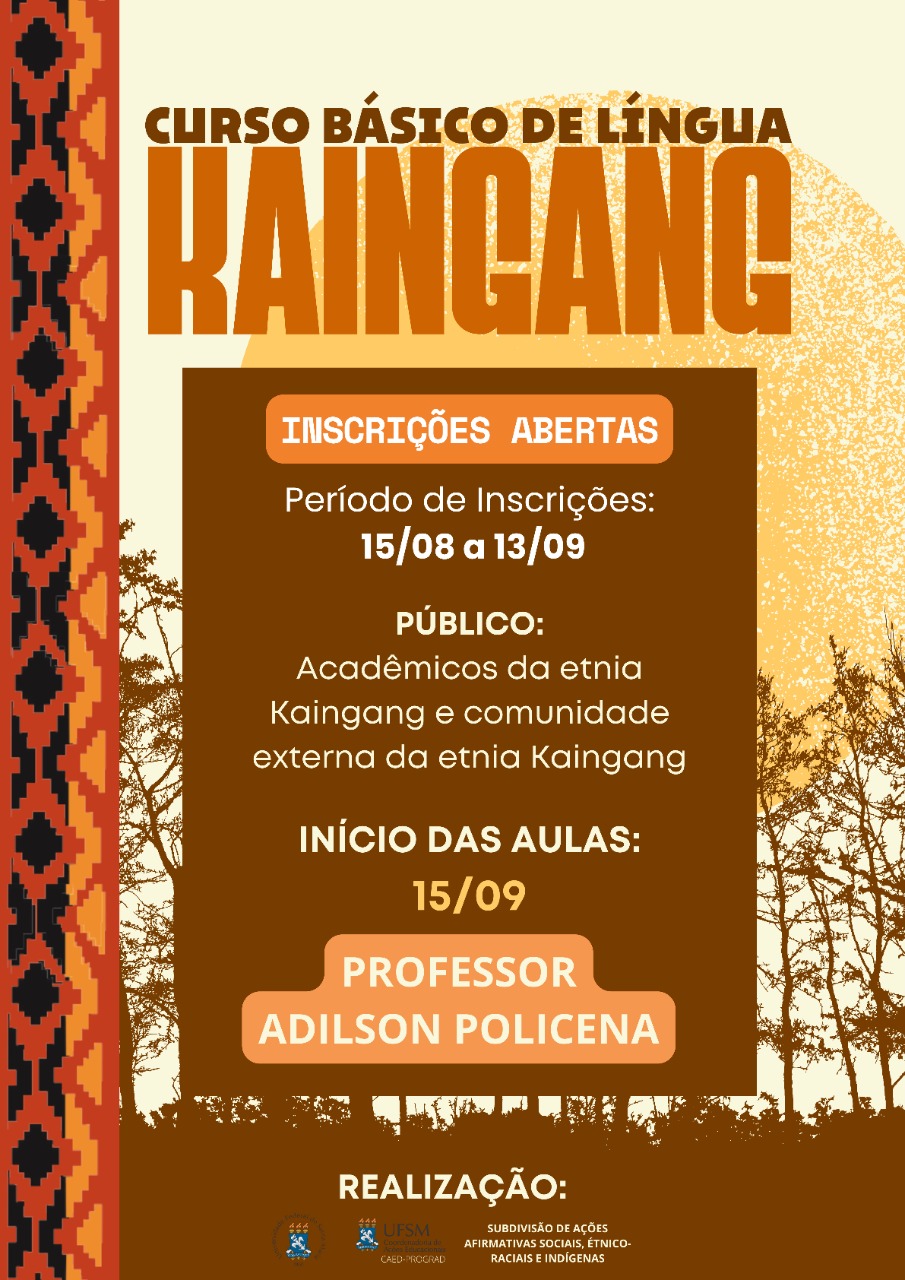 A Universidade Federal de Santa Maria (UFSM) através da Coordenadoria de Ações Educacionais (CAEd)- PROGRAD e da Subdivisão de Ações Afirmativas Sociais, Étnico-Raciais e Indígenas divulga a abertura de inscrições para o Curso Básico de Língua Kaingang, o curso ocorrerá de forma online. As aulas serão realizadas às terças e quintas-feiras, no horário das 17:00 às 18:30h. As inscrições serão realizadas via formulário, no link: https://forms.gle/rqcmCnESBK5sBFFb8