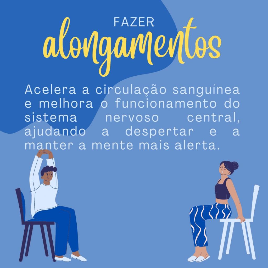 Card 2: “Fazer”, em caixa alta e na cor cinza. “Alongamentos”, na cor amarela. “Acelera a circulação sanguínea e melhora o funcionamento do sistema nervoso central, ajudando a despertar e a manter a mente mais aberta”. Abaixo, à esquerda, ilustração de um homem sentado em uma cadeira. Tem a pele negra e cabelo enrolado. Está segurando as mãos com os braços levantados para cima. A sua frente, uma mulher sentada em uma cadeira. Está com os braços para trás e os apoia no assento.