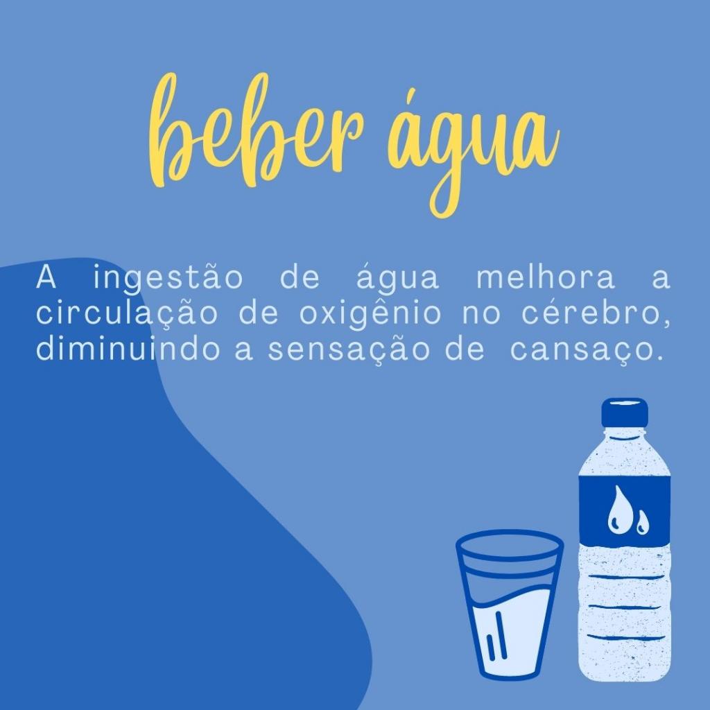 Card 3: “Beber água”, em fonte cursiva e na cor amarela. “A ingestão de água melhora a circulação de oxigênio no cérebro, diminuindo a sensação de cansaço”. Na parte inferior direita, ilustração de um copo com água. Ao lado, garrafa de água com duas gotas desenhadas no rótulo.