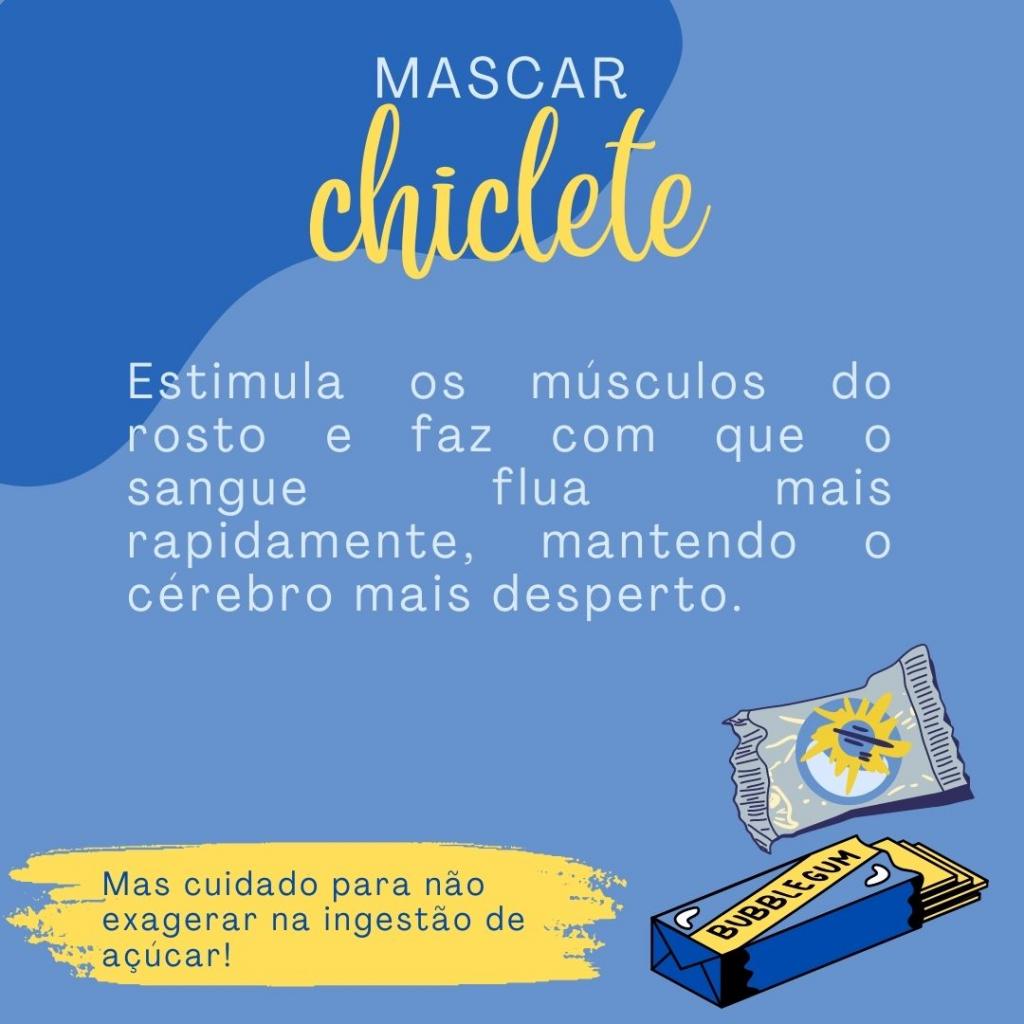 Card 4: “Mascar”, em caixa alta e na cor cinza. “Chiclete”, na cor amarela. “Estimula os músculos do rosto e faz com que o sangue flua mais rapidamente, mantendo o cérebro mais desperto”. Abaixo, sobre uma tarja amarela, o texto: “Mas cuidado para não exagerar na ingestão de açúcar”. Ao lado, ilustração de dois chicletes.