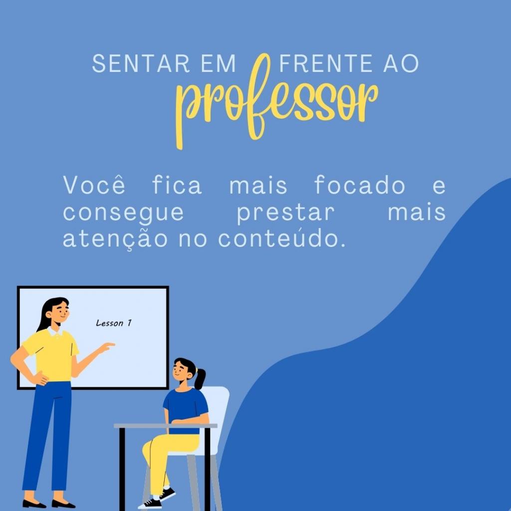 Card 5: “Sentar em frente ao” em caixa alta e na cor cinza. “Professor”, na cor amarela. “Você fica mais focado e consegue prestar mais atenção no conteúdo”. Abaixo, ilustração de uma mulher em pé em frente a um quadro negro. Está com a mão direita na cintura e a esquerda levantada. À frente, uma jovem, sentada em frente a uma mesa, olha para a professora.