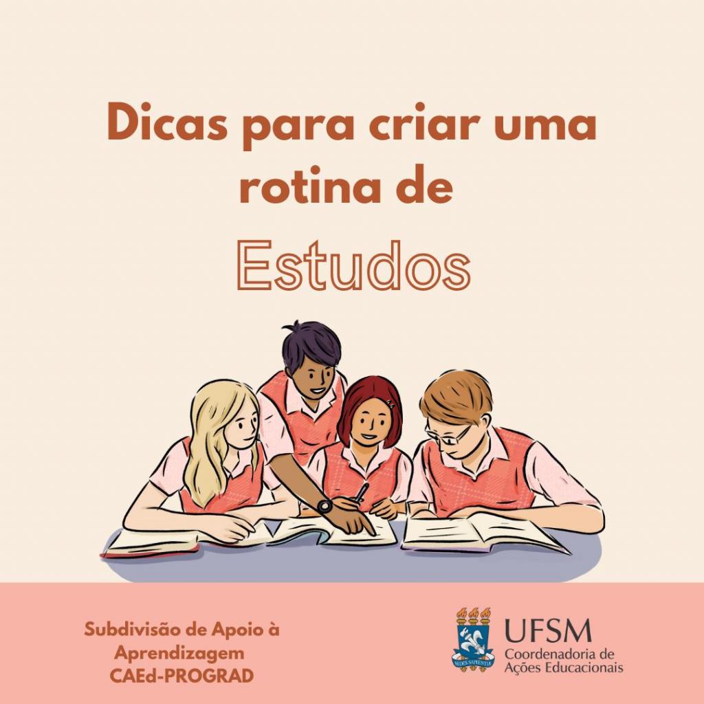 Descrição da imagem: Imagem horizontal e colorida em formato quadrado. Centralizado, o texto: “Dicas para criar uma rotina de estudos”, na cor laranja. Abaixo: ilustração de dois homens e duas mulheres debruçados em uma mesa sobre cadernos abertos. Um deles aponta para um dos cadernos e todos olham. Na parte inferior, sobre uma tarja rosa: “Subdivisão de Apoio à Aprendizagem CAEd – PROGRAD. À direita, brasão da UFSM e logo da CAEd. O card possui fundo na cor bege.