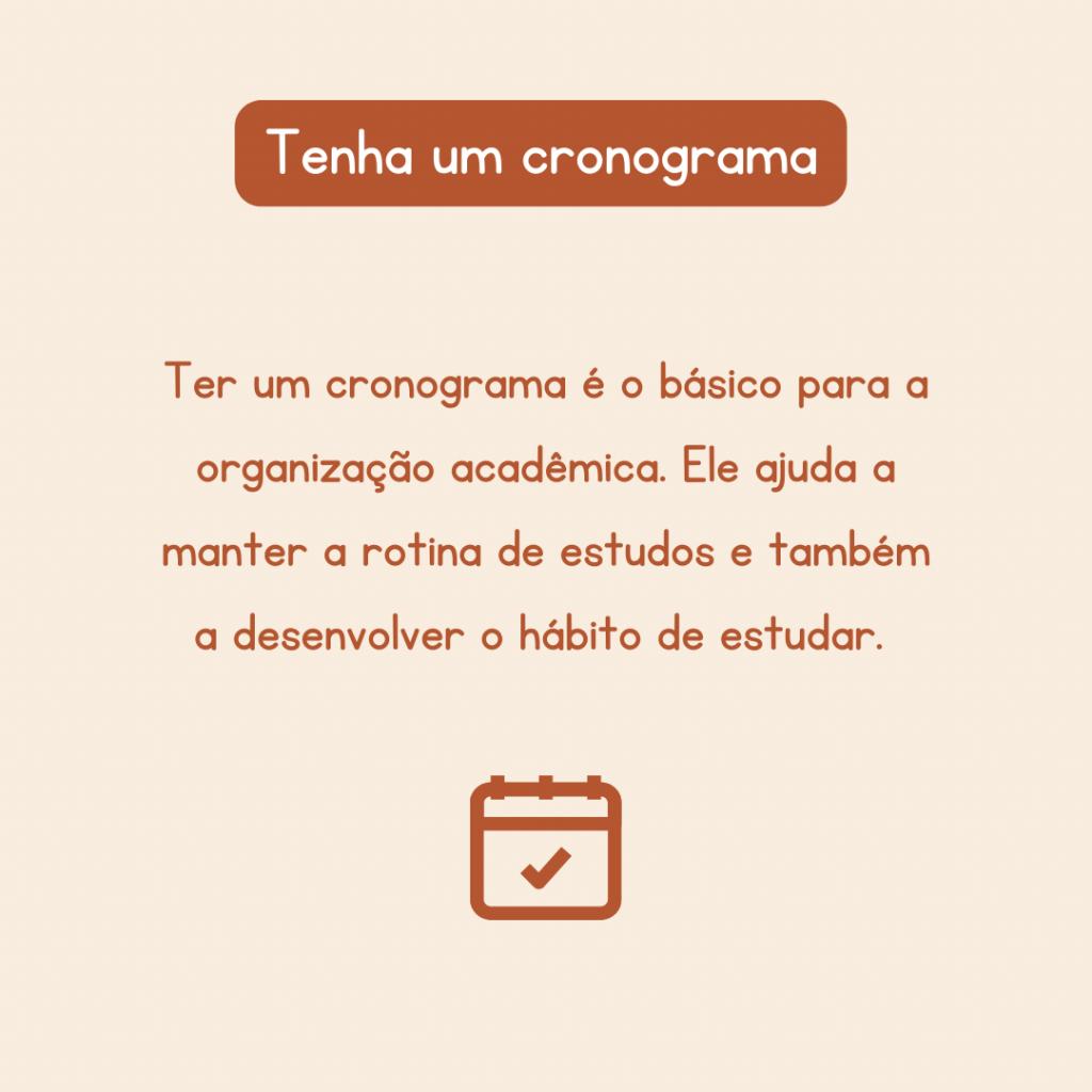 Descrição da imagem: Centralizado e na cor branca, sobre um fundo laranja, o texto: “Tenha um cronograma”. Abaixo: Ter um cronograma é o básico para a organização acadêmica. Ele ajuda a manter a rotina de estudos e também a desenvolver o hábito de estudar. Abaixo, ilustração de um calendário com um símbolo de check no centro. O card possui fundo na cor bege.