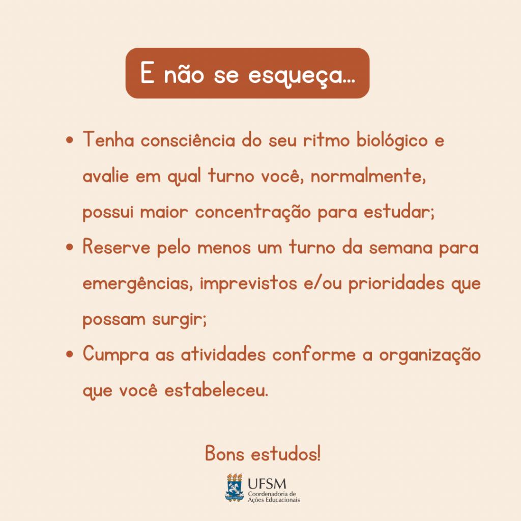Descrição da imagem: Centralizado e na cor branca, sobre um fundo laranja, o texto: “E não se esqueça…”. Abaixo, um abaixo do outro, os textos: “Tenha consciência do seu ritmo biológico e avalie em qual turno, normalmente, você possui maior concentração para estudar; Reserve pelo menos um turno da semana para emergências, imprevistos, e/ou prioridades que possam surgir; cumpra as atividades conforme a organização que você estabeleceu”. Abaixo, centralizado: “Bons estudos!”. Abaixo, logo da UFSM e da CAEd. O card possui fundo na cor bege.