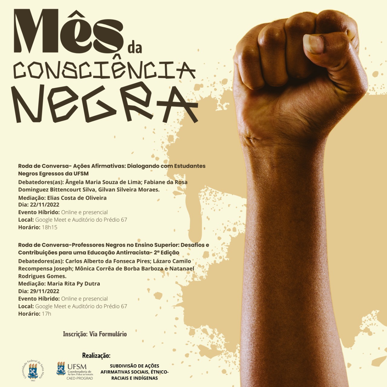 • Dia 22/11/2022- Roda de Conversa- Ações Afirmativas: Dialogando com Estudantes Negros Egressos da UFSM- Debatedores (as): Ângela Maria de Souza Lima; Fabiane da Rosa Dominguez Bittencourt Silva; Gilvan Silveira Moraes. Mediação: Elias Cósta de Oliveira. Horário 18;15. Inscrições via formulário no link: https://forms.gle/g2ueXKaUNiUVfu3BA