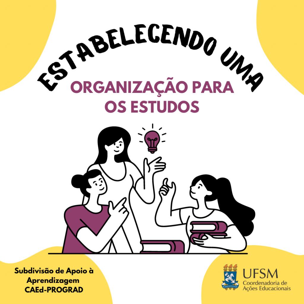 Descrição da imagem: Card horizontal e colorido em formato quadrado. Centralizado, o texto: “Estabelecendo uma organização para os estudos”, na cor preta e roxa. Abaixo, ilustração de três mulheres, duas sentadas e uma em pé. Olham para uma lâmpada no centro. Uma das mulheres segura dois livros e há outro sobre a mesa. Na parte inferior, o texto: “Subdivisão de Apoio à Aprendizagem. CAEd – PROGRAD” e brasão da UFSM. O card possui fundo branco com as laterais amarelas.