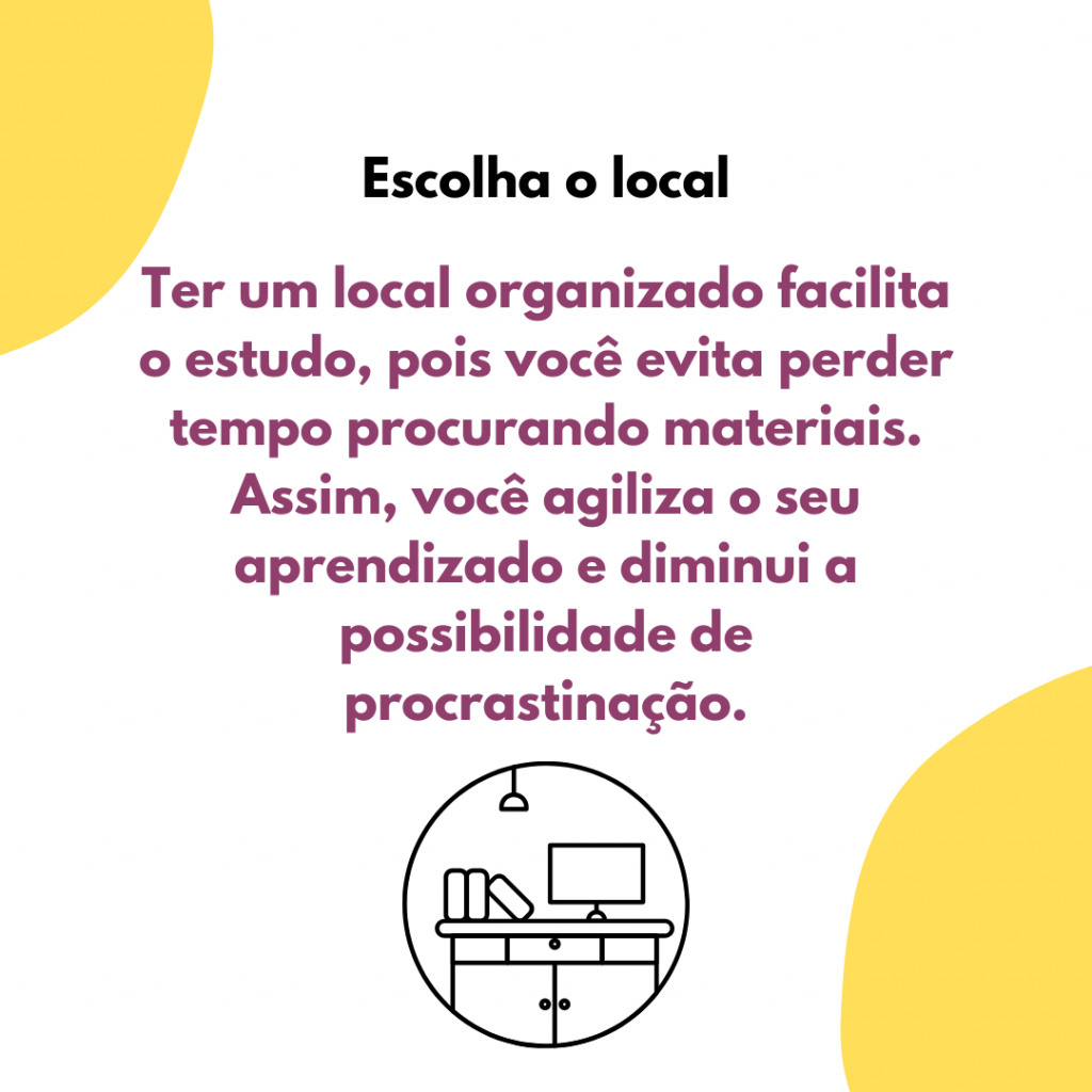 Descrição da imagem: Centralizado, o texto: “Escolha o local”, na cor preta. Abaixo: “Ter um local organizado facilita o estudo, pois você evita perder tempo procurando materiais. Assim, você agiliza o seu aprendizado e diminui a possibilidade de procrastinação”, na cor roxa. Abaixo, ilustração de uma escrivaninha com computador e livros.