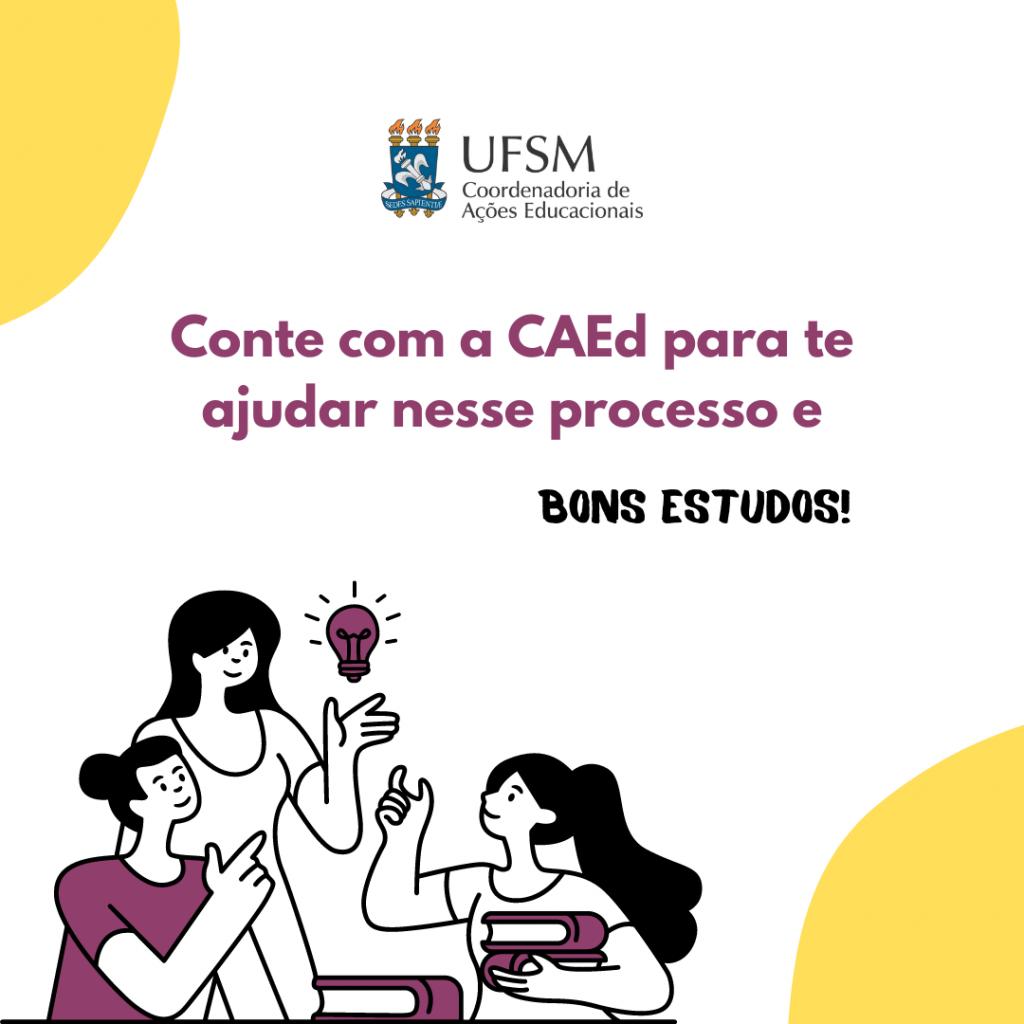 Descrição da imagem: Centralizado, brasão da UFSM. Abaixo, o texto: “Conte com a CAEd para te ajudar nesse processo e”, na cor roxa. Abaixo: “Bons estudos!”, na cor preta. Abaixo, ilustração de três mulheres, duas sentadas e uma em pé. Olham para uma lâmpada no centro. Uma das mulheres segura dois livros e há outro sobre a mesa.
