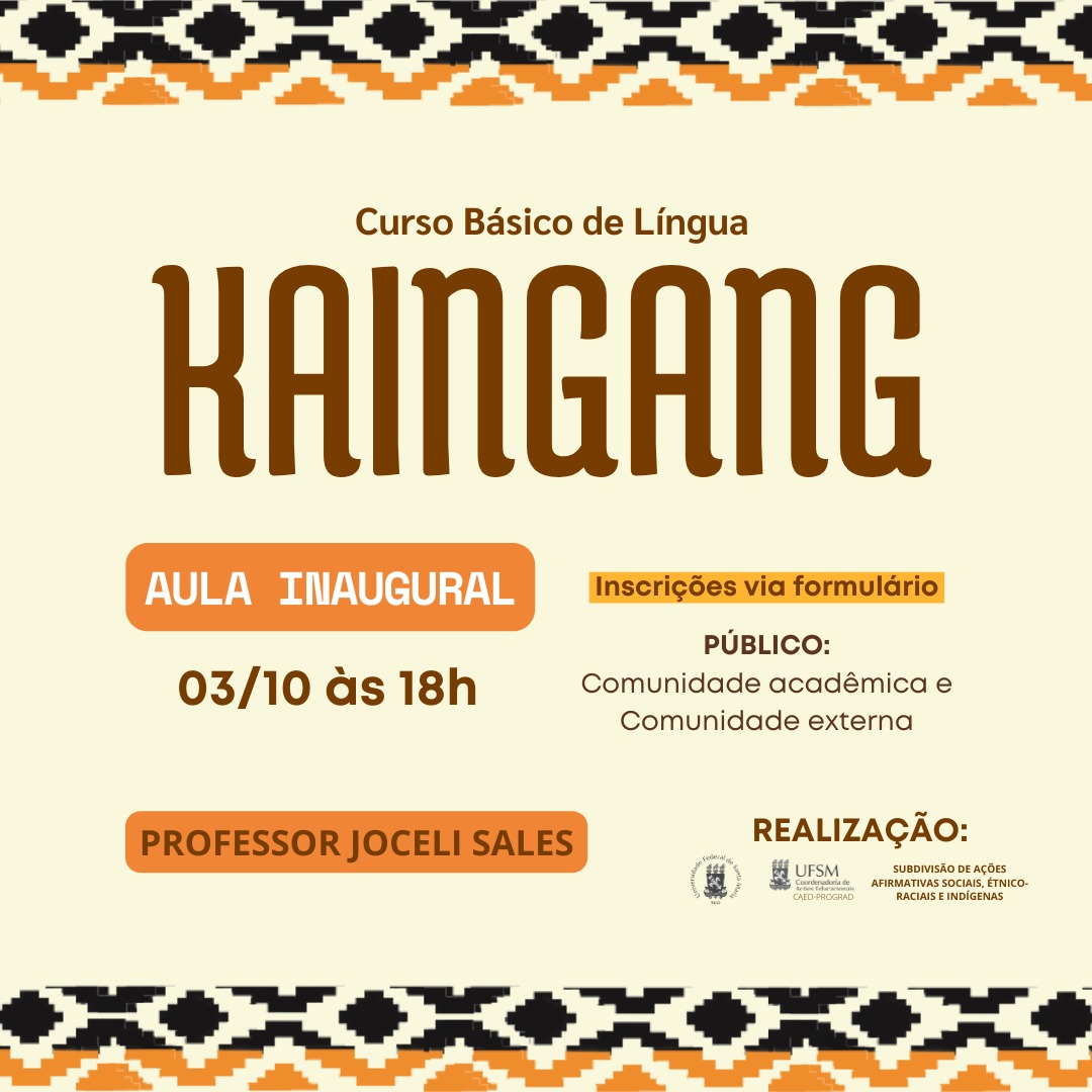 A Universidade Federal de Santa Maria (UFSM), por meio da Pró-Reitoria de Graduação (PROGRAD), da Coordenadoria de Ações Educacionais (CAEd) e da Subdivisão de Ações Afirmativas Sociais, Étnico-Raciais e Indígenas, convida a Comunidade Acadêmica e a Comunidade Externa para participar da Aula Inaugural do Curso Básico de Língua Kaingang, que será realizada dia 03/10/2023, às 18h. A inscrição para participar da Aula Inaugural do Curso Básico de Língua Kaingang será via formulário pelo link: https://forms.gle/ARP7FqLASWhE91ry8