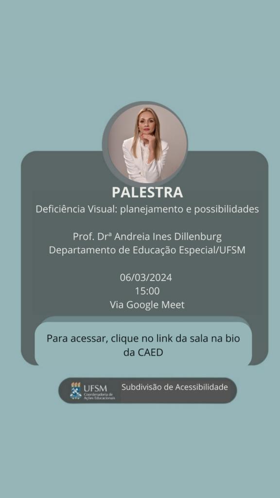 Descrição da imagem: Card com fundo verde água. Centralizado, um quadrado cinza com as informações, uma abaixo da outra: “Palestra” “Deficiência Visual: planejamento e possibilidades.” “Profa. Dra. Andreia Ines Dillenburg. Departamento de Educação Especial/UFSM” “06/03/24; 15:00; Via Google Meet”. Logo abaixo, dentro de um retângulo verde água, lê-se “Para acessar, clique no link da sala na bio da Caed”. Centralizada na parte superior do retângulo cinza, uma fotografia da profa. Andreia, da cintura para cima, ela é loira, tem cabelos longos e está com o queixo apoiado na mão esquerda. Centralizado, na parte inferior, o brasão da UFSM com “UFSM Coordenadoria de Ações Educacionais” ao lado e à direita “Subdivisão de Acessibilidade”. Fim da descrição.