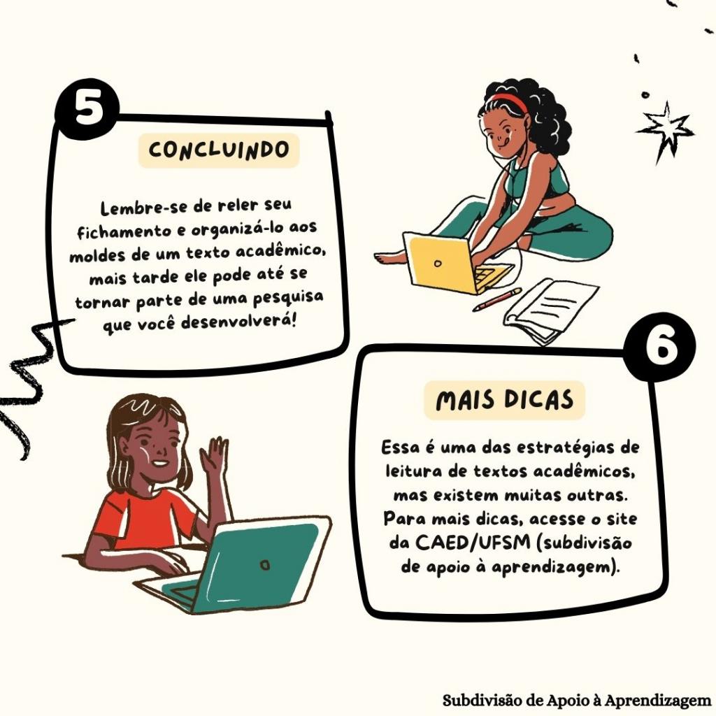 Centralizado no terceiro card estão dois quadrados numerados “5” e “6”, um em diagonal ao outro. No primeiro quadrado o texto “5 – Concluindo: Lembre-se de reler seu fichamento e organizá-lo aos moldes de um texto acadêmico, mais tarde ele pode até se tornar parte de uma pesquisa que você desenvolverá!”. No quadro seguinte consta “6 – Mais dicas: Essa é uma das estratégias de leitura de textos acadêmicos, mas existem muitas outras. Para mais dicas, acesse o site da CAED/UFSM (Subdivisão de Apoio à Aprendizagem)”. À direita do primeiro quadrado, a figura de uma mulher sentada no chão, usando um notebook. A mulher usa fones de ouvidos e tem ao lado do notebook um lápis e um caderno. À esquerda do segundo quadrado está a figura de uma mulher sentada com um notebook a sua frente. Está com o braço direito sobre uma mesa e o braço esquerdo erguido, com os cotovelos encostados na mesa. No canto inferior direito “Subdivisão de Apoio à Aprendizagem”.