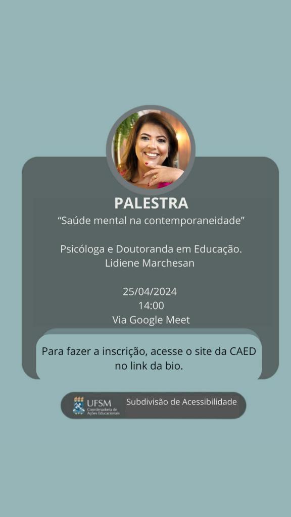 Descrição de imagem: Card com fundo verde água. Centralizado, um quadrado cinza com as informações, uma abaixo da outra: “Palestra” “Saúde Mental na contemporaneidade” “Psicóloga e Doutoranda em Lidiene Marchesan” “25/04/24; 14:00; Via Google Meet”. Logo abaixo, dentro de um retângulo verde água, lê-se ” Para fazer a inscrição, acesse o site da CAED no link da bio.”Centralizada na parte superior do retângulo cinza, uma fotografia da psicóloga Lidiene, dos ombros para cima, ela é morena, tem cabelos lisos na altura dos ombros, está sorrindo e tem a mão esquerda sob o queixo. Centralizado, na parte inferior, o brasão da UFSM com “UFSM Coordenadoria de Ações Educacionais” ao lado e à direita “Subdivisão de Acessibilidade”. Fim da descrição.