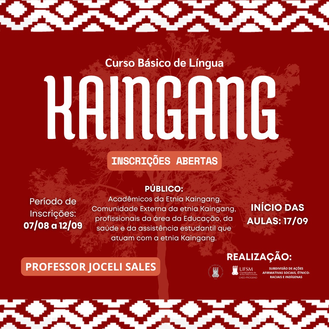A Universidade Federal de Santa Maria (UFSM) através da Coordenadoria de Ações Educacionais (CAEd)- PROGRAD e da Subdivisão de Ações Afirmativas Sociais, Étnico-Raciais e Indígenas divulga a abertura de inscrições para o Curso Básico de Língua Kaingang, o curso ocorrerá de forma presencial e on-line. As aulas serão realizadas às terças e sextas-feiras, no horário das 17:30 às 19:00h. As inscrições serão realizadas via formulário, no link: https://forms.gle/Wnmoc5oVWoKY6Ek87