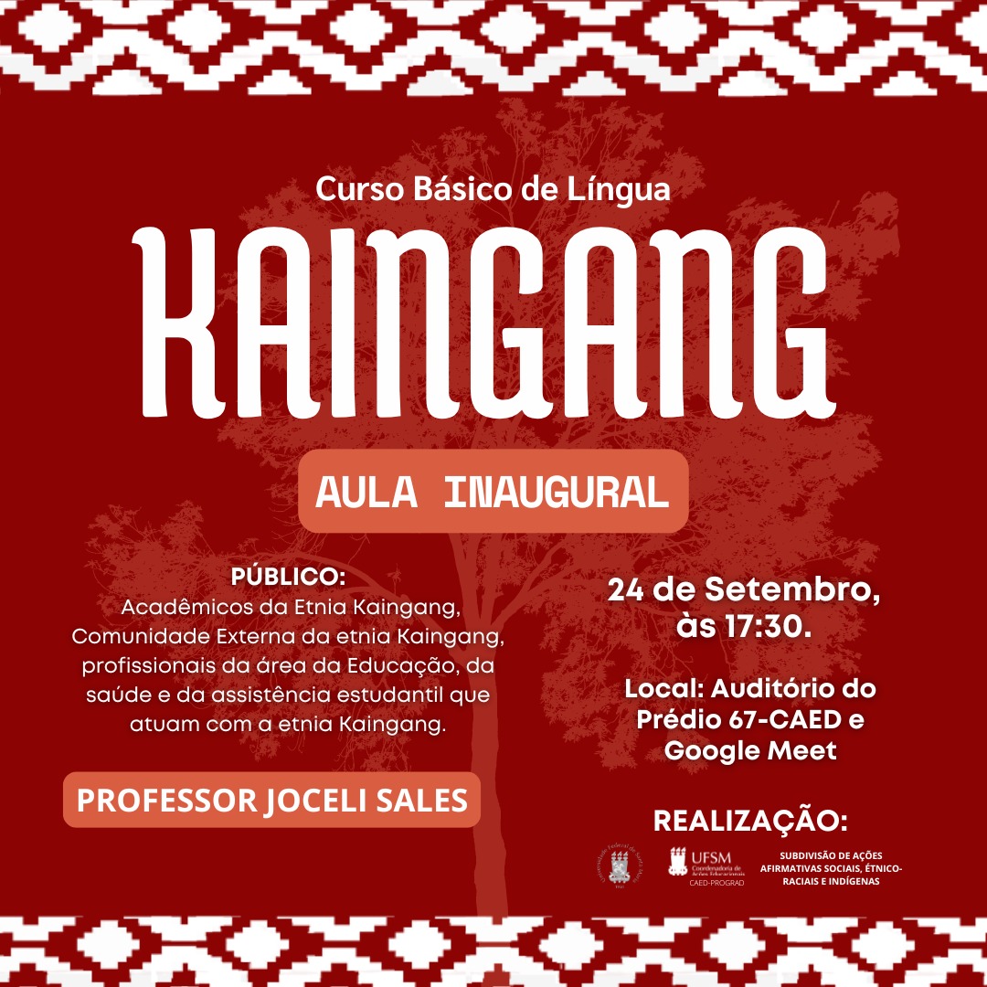 A Universidade Federal de Santa Maria (UFSM), por meio da Pró-Reitoria de Graduação (PROGRAD), da Coordenadoria de Ações Educacionais (CAEd) e da Subdivisão de Ações Afirmativas Sociais, Étnico-Raciais e Indígenas, convida a Comunidade Acadêmica e a Comunidade Externa para participar da Aula Inaugural do Curso Básico de Língua Kaingang, que será realizada em formato híbrido, dia 24/09/2023, às 17h30min. A inscrição para participar da Aula Inaugural do Curso Básico de Língua Kaingang será via formulário pelo link: https://forms.gle/yzD3uxV3p9zGdxGw5