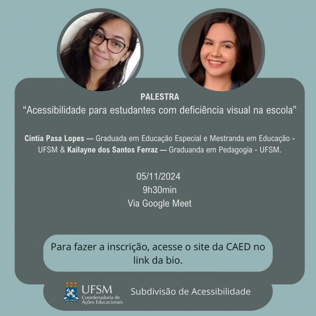 Descrição de imagem: Card informativo com fundo cinza claro. Ao centro, um quadrado cinza escuro e sobreposto na parte superior deste quadrado, duas fotos de mulheres. A primeira encontra-se ao lado esquerdo, tem pele parda, olhos e cabelos castanhos escuros, seu cabelo é liso e comprido, usa óculos de armação grande e quadrada na cor preta, esboça um leve sorriso. Já a segunda, está à direita, tem pele parda, olhos e cabelos castanhos escuros, seu cabelo é liso e comprido, sorri na fotografia. Logo abaixo, as informações: “Palestra”, “Acessibilidade para estudantes com deficiência visual na escola”, “Cíntia Pasa Lopes — Graduada em Educação Especial e Mestranda em Educação – UFSM”, “Kailayne dos Santos Ferraz — Graduanda em Pedagogia Licenciatura – UFSM, “05/11/2024”, “09h30” e “Via Google Meet”. Sobreposto na parte inferior do quadrado, um retângulo cinza claro contendo: “Para fazer a inscrição, acesse o site da CAED no link da bio”. Abaixo, um retângulo na cor cinza escuro, contendo: à esquerda, o brasão da UFSM com “UFSM Coordenadoria de Ações Educacionais” ao lado e à direita “Subdivisão de Acessibilidade”. Fim da descrição.