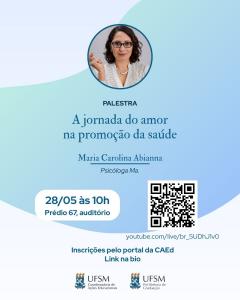 A Coordenadoria de Ações Educacionais (CAEd-PROGRAD/UFSM) convida todos para a palestra “A Jornada do Amor na Promoção da Saúde”, a ser ministrada pela psicóloga Maria Carolina Abbiana, no dia 28 de maio de 2025, às 10h00min, no Auditório do Prédio 67