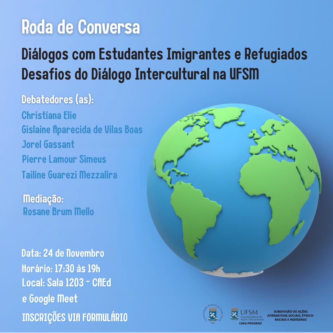 A Universidade Federal de Santa Maria (UFSM) através da Coordenadoria de Ações Educacionais CAEd-PROGRAD e da Subdivisão de Ações Afirmativas Sociais, Étnico-Raciais e Indígenas convida os estudantes imigrantes e refugiados para a Roda de Conversa: “Diálogos com Estudantes Imigrantes e Refugiados- “Desafios do Diálogo Intercultural na UFSM”, que será realizada no dia 24 de novembro, às 17h30min. A Roda de Conversa será realizada de forma híbrida (presencial e on-line) e as inscrições podem ser realizadas via formulário, no link: https://forms.gle/BA1eFrbWwFgdjdGm7