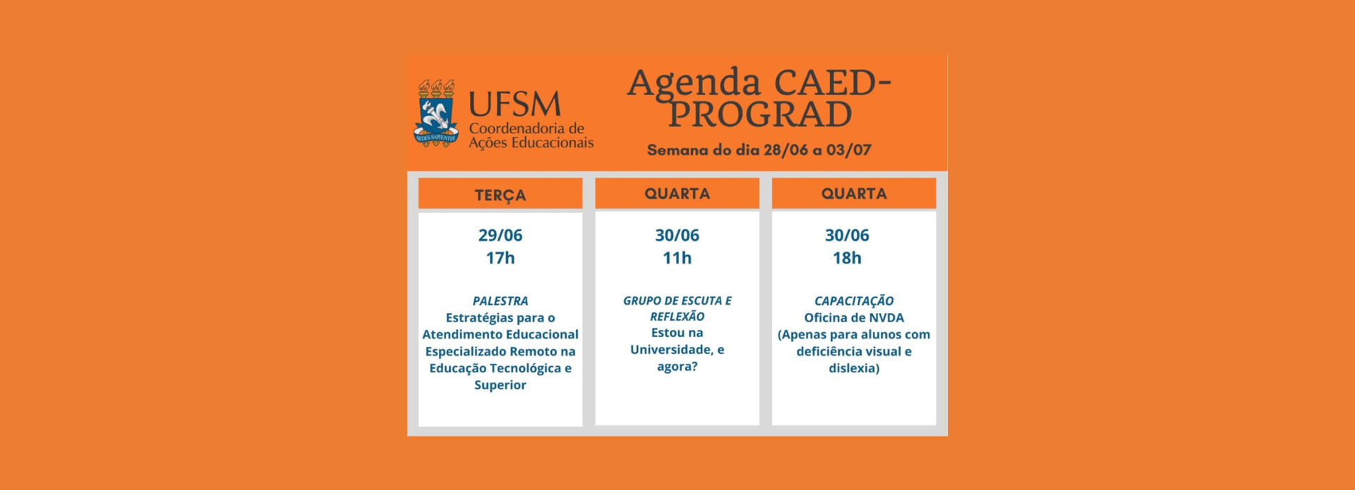 Estágios CAEDA CAED oferece: Estágio curricular para os estudantes do Curso de Educação Especial da UFSM. Informações pelo e-mail: caed.acessibilidade@ufsm.br. Estágio curricular [...]