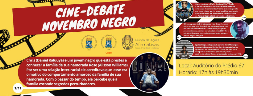 Núcleo de Ações Afirmativas Sociais, Étnico-Raciais e Indígenas – CAED UFSM, irá promover, durante o Mês da Consciência Negra – UFSM 2019, Cine Debates com filmes protagonizados por atores e atrizes negros e negras.
