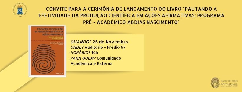 O Núcleo de Ações Afirmativas da Coordenadoria de Ações Educacionais-CAED/UFSM Convida a Comunidade Acadêmica e Externa para a Cerimônia de Lançamento do livro: “Pautando a Efetividade da Produção Científica em Ações Afirmativas: Programa Pré-Acadêmico Abdias do Nascimento” que ocorrerá no dia 26 de novembro de 2019, às 16h no Auditório do Prédio 67.