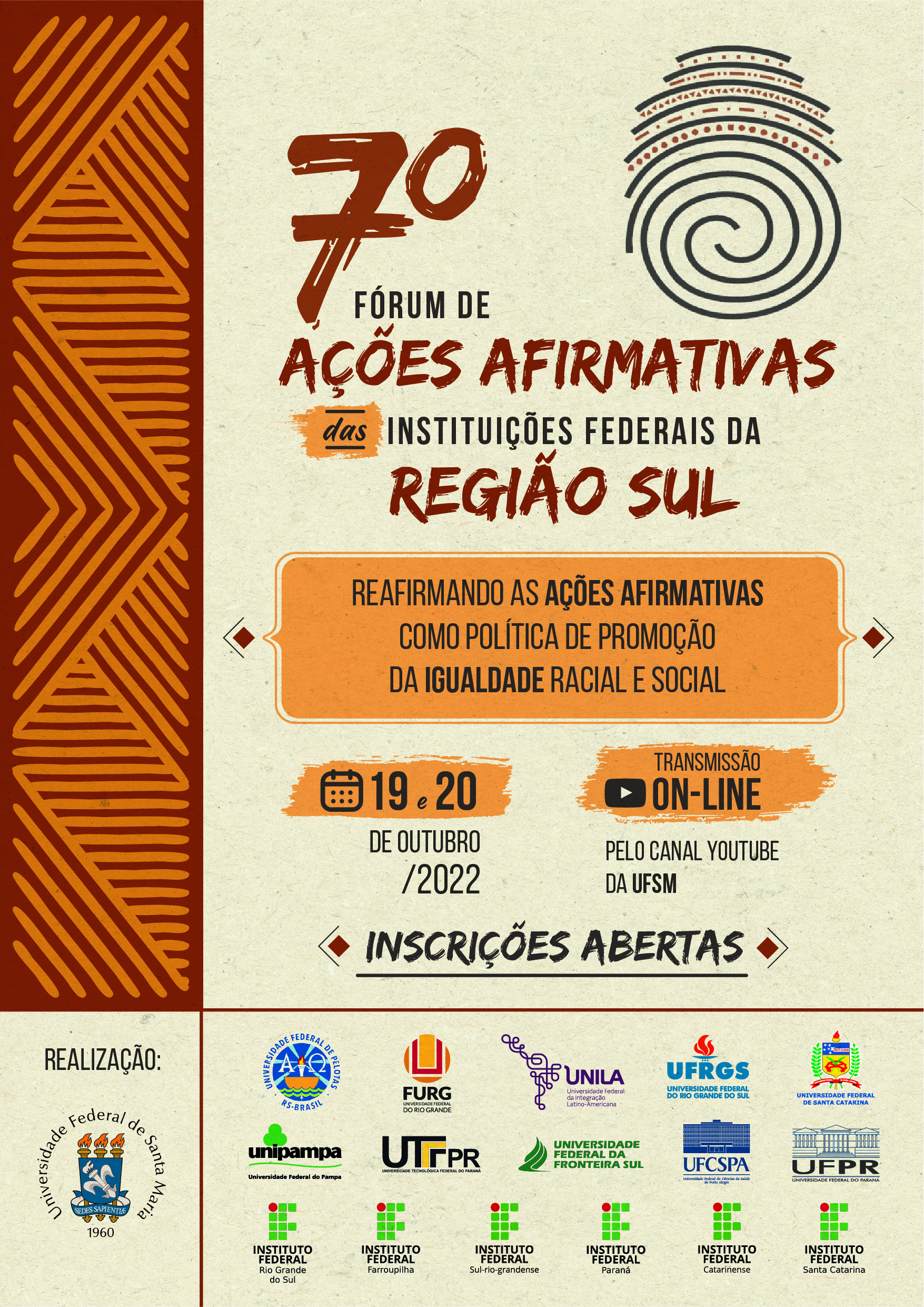 A Universidade Federal de Santa Maria, através da Pró-Reitoria de Graduação, da Coordenadoria de Ações Educacionais e da Subdivisão de Ações Afirmativas Sociais, Étnico-Raciais e Indígenas convida todas as pessoas interessadas em participar do “7º Fórum de Ações Afirmativas das Instituições Federais da Região Sul”. O Fórum é um evento organizado pelas Instituições Federais da Região Sul, que vem se consolidando como um importante e fundamental espaço de compartilhamento de experiências, diálogo e estudo no âmbito da gestão em ações afirmativas, que nessa edição será sediado pela Universidade Federal de Santa Maria.