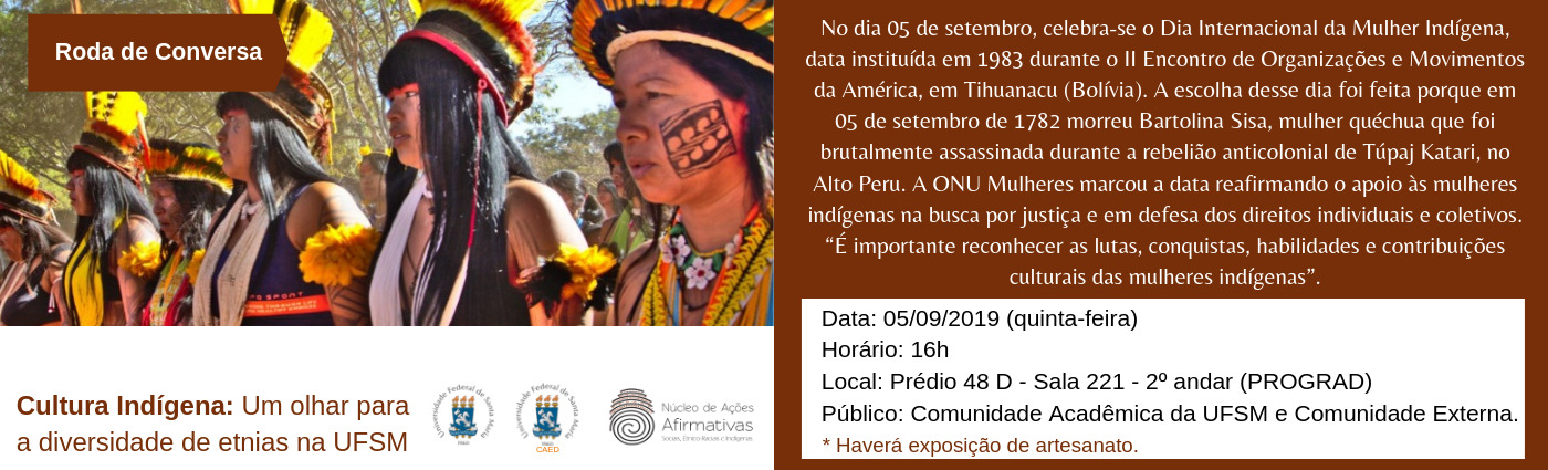O Núcleo de Ações Afirmativas Sociais, Étnico-Raciais e Indígenas – CAED/UFSM, convida a comunidade acadêmica e a comunidade externa, para a Roda de Conversa “Cultura Indígena: Um olhar para a diversidade de etnias na UFSM”