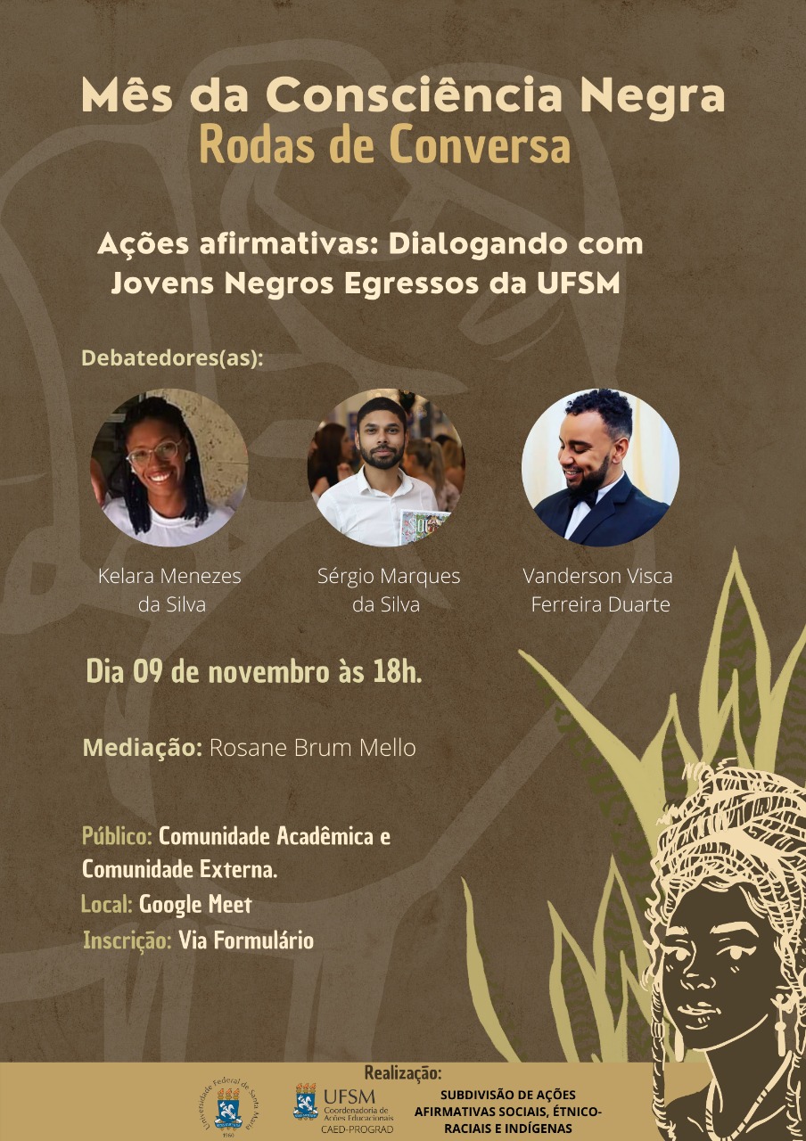 A Universidade Federal de Santa Maria (UFSM) através da Coordenadoria de Ações Educacionais-CAEd- PROGRAD e da Subdivisão de Ações Afirmativas Sociais, Étnico-Raciais e Indígenas convida a comunidade acadêmica e a comunidade externa para a Roda de Conversa- “Ações Afirmativas: Dialogando com Jovens Negros Egressos da UFSM”, que será realizada no dia 09 de novembro, às 18h.  A Roda de Conversa faz parte da Programação Mês da Consciência Negra. A Roda de Conversa será realizada de forma online, pelo Google Meet e as inscrições podem ser realizadas via formulário, no link: https://forms.gle/ihwyEggjecZ4bCVc6
