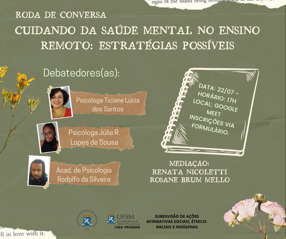 A Universidade Federal de Santa Maria (UFSM) através da Coordenadoria de Ações Educacionais (CAEd)-PROGRAD e da Subdivisão de Ações Afirmativas Sociais, Étnico-Raciais e Indígenas convida a comunidade acadêmica e a comunidade externa para a Roda de Conversa- Cuidando da Saúde Mental no Ensino Remoto: Estratégias Possíveis, que será realizada no dia 22 de julho, às 17h. A Roda de Conversa será realizada de forma online, pelo Google Meet e as inscrições podem ser realizadas via formulário, no link: https://forms.gle/SnkoW5ZAiFdHjQrp8