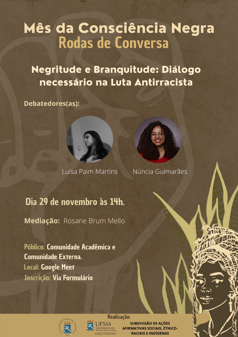 A Universidade Federal de Santa Maria (UFSM) através da Coordenadoria de Ações Educacionais-CAEd- PROGRAD e da Subdivisão de Ações Afirmativas Sociais, Étnico-Raciais e Indígenas convida a comunidade acadêmica e a comunidade externa para a Roda de Conversa- Negritude e Branquitude: Diálogo necessário na Luta Antirracista, que será realizada no dia 29 de novembro, às 14h.  A Roda de Conversa faz parte da Programação do CalendAfro-Novembro Negro 2021. A Roda de Conversa será realizada de forma online, pelo Google Meet e as inscrições podem ser realizadas via formulário, no link: https://forms.gle/bNkW1GL5D3SBSgVF9