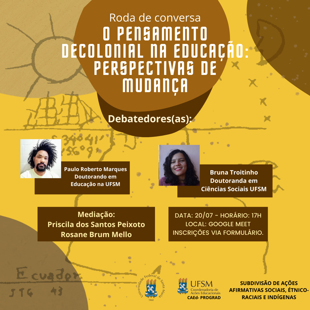A Universidade Federal de Santa Maria (UFSM) através da Coordenadoria de Ações Educacionais (CAEd)-PROGRAD e da Subdivisão de Ações Afirmativas Sociais, Étnico-Raciais e Indígenas convida a comunidade acadêmica e a comunidade externa para a Roda de Conversa: O Pensamento Decolonial na Educação: Perspectivas de mudança, que será realizada no dia 20 de julho, às 17h. A Roda de Conversa será realizada de forma online, pelo Google Meet e as inscrições podem ser realizadas via formulário, no link: https://forms.gle/tJsHi1q4sj2je5f49