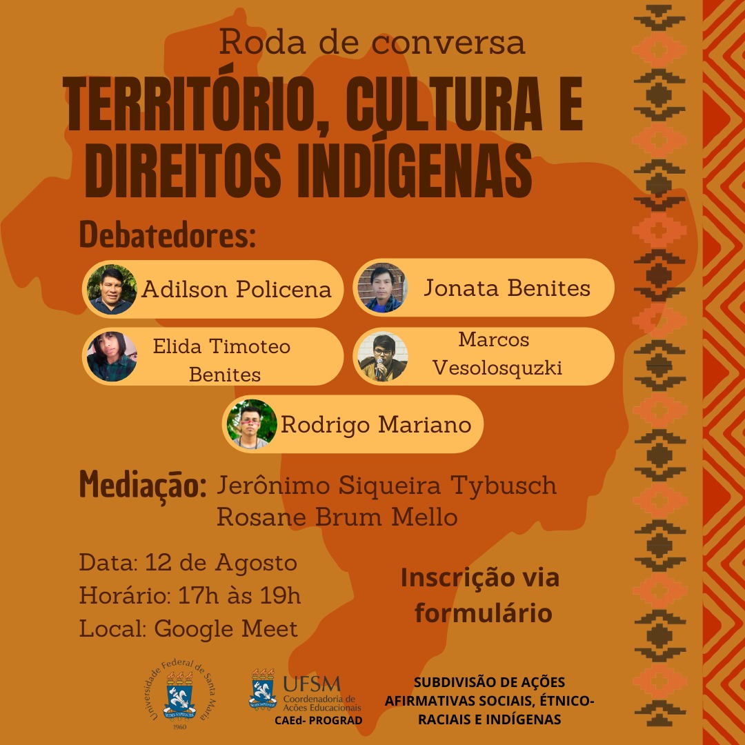 A Universidade Federal de Santa Maria (UFSM) através da Coordenadoria de Ações Educacionais (CAEd)-PROGRAD e da Subdivisão de Ações Afirmativas Sociais, Étnico-Raciais e Indígenas convida a comunidade acadêmica e a comunidade externa para a Roda de Conversa- Território, Cultura e Direitos Indígenas, que será realizada no dia 12 de agosto, às 17h. A Roda de Conversa será realizada de forma online, pelo Google Meet e as inscrições podem ser realizadas via formulário, no link: https://forms.gle/r7pQk6on1NZqJPQF6