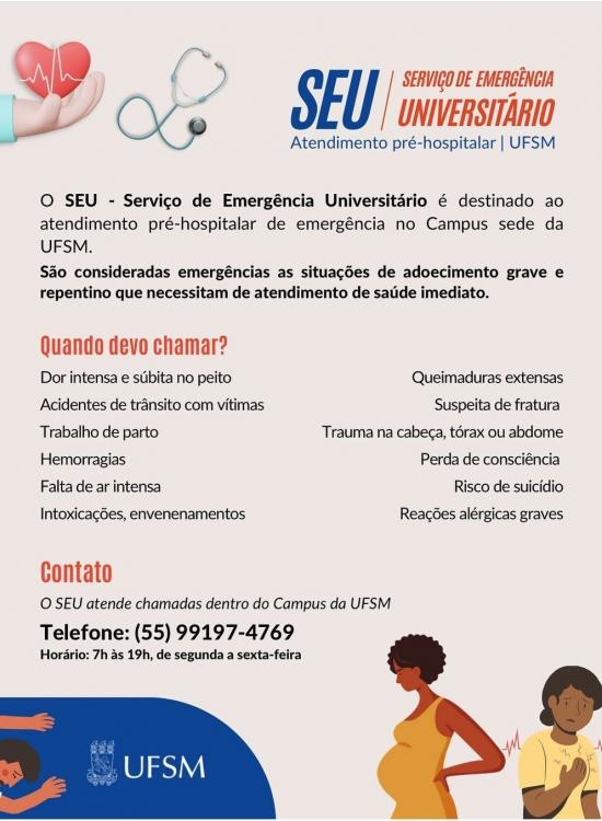 Descrição da imagem: card informativo, com fundo branco. Na parte superior, há brasão do SEU. Ao lado, lê-se “SEU - Serviço de Emergência Universitário, atendimento pré-hospitalar UFSM”. Abaixo, está escrito: “Está em funcionamento, no campus sede da UFSM, o Serviço de Emergência Universitário (SEU), uma equipe capacitada para atuar em casos de urgência e emergência, com ambulância à disposição”. Em seguida, lê-se “Quando devo chamar?”, e, abaixo, os itens: “dor no peito de aparecimento súbito; acidentes de trânsito com vítimas; trabalho de parto; sangramentos graves e hemorragias; falta de ar; situações de intoxicação e envenenamento; queda acidental, atropelamento; queimaduras graves; traumas: fraturas, tórax, crânio e abdômen; perda de consciência e convulsões”. Mais abaixo, em um quadro laranja, está escrito: “O SEU pode ser acionado através dos agentes de portaria dos prédios do campus sede e/ou pela vigilância”. Por fim, no canto inferior direito, há o brasão da UFSM.