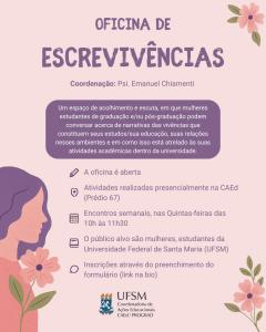 PROPOSTA: Esta oficina tem como objetivo auxiliar os pós-graduandos da UFSM a superar desafios na escrita acadêmica, incluindo dissertações, teses e artigos científicos. Através de encontros regulares, proporcionamos um espaço de acolhimento e apoio, onde os participantes podem compartilhar experiências, aprender estratégias e técnicas eficazes para melhorar suas habilidades de escrita. Além disso, abordamos aspectos psicológicos como autoconhecimento, motivação e autoconfiança, visando promover um desenvolvimento acadêmico pleno e saudável.