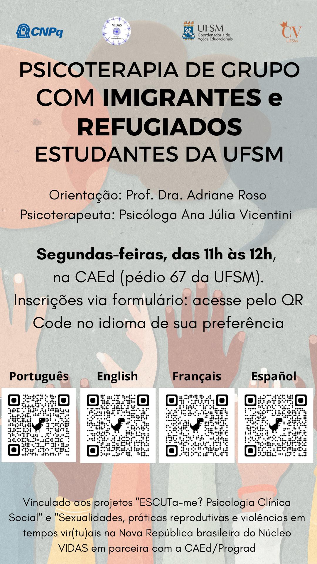 PROPOSTA: O Grupo terapêutico visa atender as necessidades emocionais de pós-graduandos da UFSM, oferecendo um espaço de acolhimento e apoio emocional. Através da escuta ativa e do acolhimento, buscamos proporcionar um ambiente seguro para a expressão de sentimentos, redução das angústias, promoção do bem-estar psicológico, expressão de sentimentos e experiências pessoais relacionadas à vida acadêmica, reflexão sobre estratégias para lidar com a pressão acadêmica e desenvolvimento de habilidades de autocuidado e resiliência emocional.
