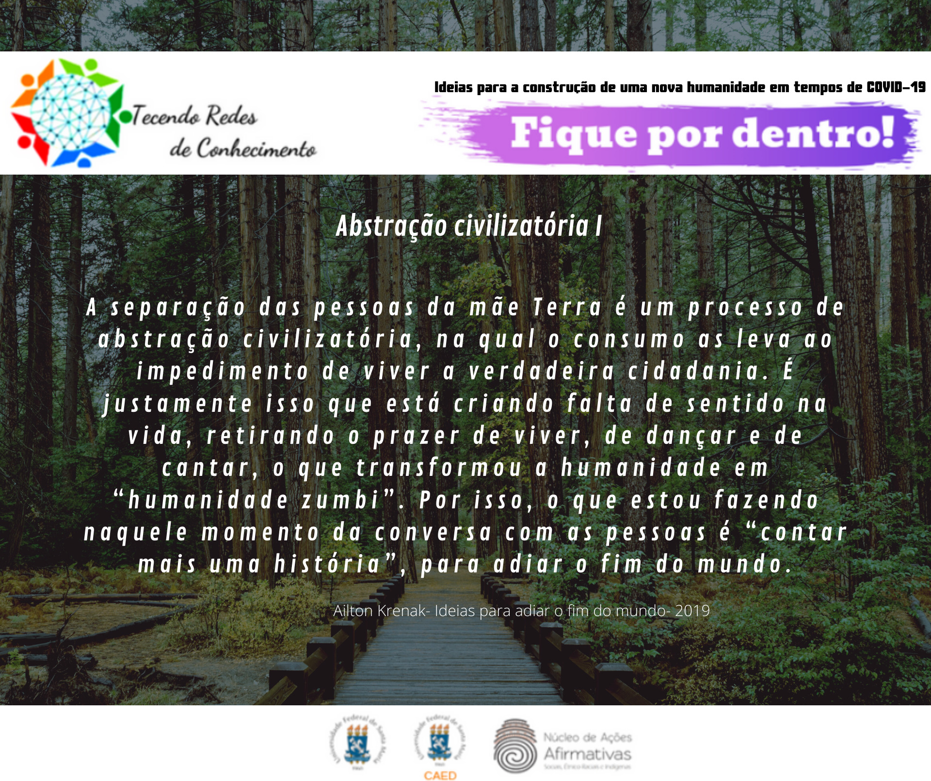 A separação das pessoas da mãe Terra é um processo de abstração civilizatória, na qual o consumo as leva ao impedimento de viver a verdadeira cidadania. É justamente isso que está criando falta de sentido na vida, retirando o prazer de viver, de dançar e de cantar, o que transformou a humanidade em “humanidade zumbi”. Por isso, o que estou fazendo naquele momento da conversa com as pessoas é “contar mais uma história”, para adiar o fim do mundo.