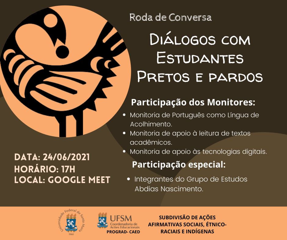 DESCRIÇÃO DA IMAGEM: cartaz de divulgação de roda de conversa, em formato quadrado, com fundo em tons de marrom escuro e claro. A parte inferior, de cor marrom clara, tem efeito de ondas. À direita, em letras brancas, de diversos tamanhos, lê-se: “Roda de conversa”, “Diálogos com estudantes pretos e pardos”, “Participação dos monitores:”, “Monitoria de Português como Língua de Acolhimento”, “Monitoria de apoio à leitura de textos acadêmicos”, “Monitoria de apoio às tecnologias digitais”, “Participação especial:”, “Integrantes do Grupo de Estudos Abdias Nascimento”. À esquerda, inserida em formato circular, há a representação da arte africana, com figuras angulosas. Abaixo, há as informações sobre a data de realização, onde lê-se: “DATA: 24 /06 /2021”, “HORÁRIO: 17H”, “LOCAL: GOOGLE MEET”. Na parte inferior, inseridos num retângulo marrom claro, há o brasão da Universidade Federal de Santa Maria (UFSM), formado pelos seguintes elementos: três archotes de fogo, que simbolizam os três pilares da universidade: ensino, pesquisa e extensão; a flor-de-lis, simbolizando a purificação, e os archotes com a chama do conhecimento, representando a luz que ilumina o caminho para a sabedoria; o brasão, denotando moral e respeito; a frase em latim “Sedes Sapientiae”, que significa sede (lugar, casa) da sabedoria*. O brasão está circundado pela inscrição Universidade Federal de Santa Maria, tendo na base o ano 1960. À direita, há novamente o brasão, junto da inscrição “UFSM”, “Coordenadoria de Ações Educacionais”, “PROGRAD-CAED” e, na sequência, no mesmo sentido horizontal, “SUBDIVISÃO DE AÇÕES AFIRMATIVAS SOCIAIS, ÉTNICO-RACIAIS E INDÍGENAS”. Fonte da descrição: Identidade Visual (https://www.ufsm.br/identidade-institucional/), em 21 de junho de 2021.