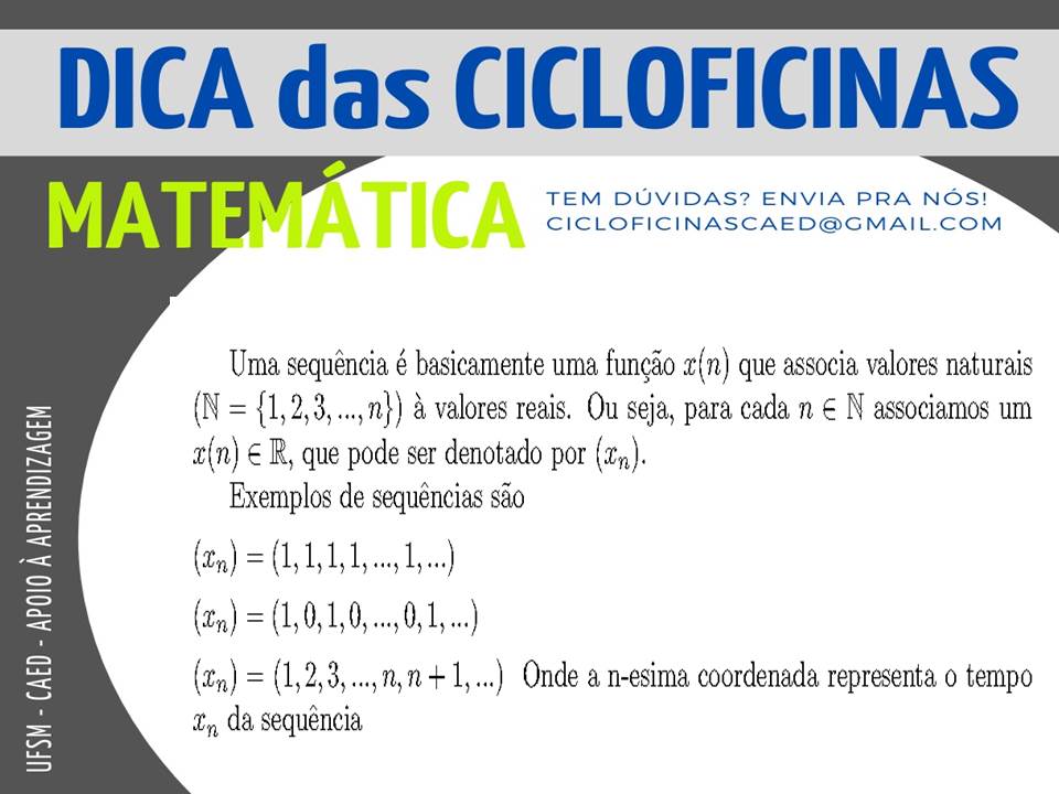 Descrição da imagem: Imagem retangular na horizontal, o fundo é na cor cinza escuro. Na parte superior há um retângulo na cor cinza claro onde tem escrito em letras na cor azul o título “Dica das Cicloficinas”. Abaixo e no lado esquerdo, em letras na cor verde “Matemática” e do lado direito em letras pequenas e na cor azul “Tem dúvidas? Envia pra nós! cicloficinascaed@gmail.com”. No centro da imagem há um círculo na cor branca e dentro dele, em letras na cor preta há o seguinte texto: “Uma sequência é basicamente uma função x(n) que associa valores naturais {N = {1,2,3, …, n}) à valores reais. Ou seja, para cada n N associamos um x(n)R, que pode ser denotado por (xn). Exemplos de sequências são (xn) = (1,1,1,1, …, 1, …). (xn) = (1,0,1,0, …, 0, 1, …). (xn) = (1,2,3, …, n, n+1, …) Onde a n-esima coordenada representa o tempo xn da sequência. Na lateral esquerda da imagem, na vertical, em letras na cor branca há “UFSM – CAED – Apoio à Aprendizagem”
