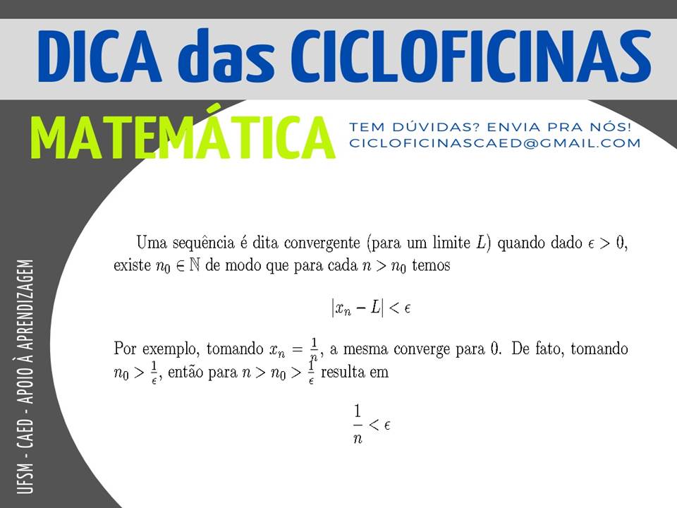 Descrição da imagem: Imagem retangular na horizontal, o fundo é na cor cinza escuro. Na parte superior há um retângulo na cor cinza claro onde tem escrito em letras na cor azul o título “Dica das Cicloficinas”. Abaixo e no lado esquerdo, em letras na cor verde “Matemática” e do lado direito em letras pequenas e na cor azul “Tem dúvidas? Envia pra nós! cicloficinascaed@gmail.com”. No centro da imagem há um círculo na cor branca e dentro dele, em letras na cor preta há o seguinte texto: “Uma sequência é dita convergente (para um limite L) quando dado > 0, existe n0 N de modo que para cada n > n0 temos Ixn – LI < Por exemplo, tomando xn = 1 n, a mesma converge para 0. De fato, tomando n0 > 1 , então para n > n0 > 1 resulta em 1 n< . Na lateral esquerda da imagem, na vertical, em letras na cor branca há “UFSM – CAED – Apoio à Aprendizagem”