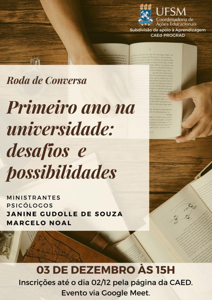 Descrição da imagem: cartaz de divulgação em formato vertical. O fundo é composto por uma imagem de uma mesa de madeira com alguns livros abertos em cima, e tem o braço de uma pessoa folheando uma página. No canto superior direito encontra-se o brasão da UFSM. Ao lado do brasão, escrito em letras na cor branca “UFSM” e, abaixo, ”Coordenadoria de Ações Educacionais”, seguido de “Subdivisão de apoio à Aprendizagem CAEd-PROGRAD”. No meio da imagem, no canto esquerdo, há um retângulo na vertical na cor bege, com transparência. Neste retângulo constam algumas informações do evento: na cor marrom “roda de conversa”, seguido de “Primeiro ano na universidade: desafios e possibilidades” como título principal. Abaixo, na cor preta, “ministrantes” e “psicólogos” seguido de “Janine Gudolle de Souza” e “Marcelo Noal”. Na parte inferior da imagem encontra-se uma barra retangular bege, com transparência. Sobre ela está escrito, na cor marrom: “03 de dezembro às 15h”, abaixo, na cor preta, “Inscrições até o dia 02/12 pela página da CAED. Evento via Google Meet”.