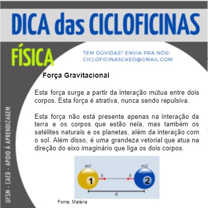 Descrição da imagem: Imagem retangular na horizontal, o fundo é na cor cinza escuro. Na parte superior há um retângulo na cor cinza claro onde tem escrito em letras na cor azul o título “Dica das Cicloficinas”. Abaixo e no lado esquerdo, em letras na cor verde “Física” e do lado em letras pequenas e na cor azul “Tem dúvidas? Envia pra nós! cicloficinascaed@gmail.com”. No centro da imagem há um círculo na cor branca e dentro dele, em letras na cor preta “Força gravitacional” e abaixo o texto “Esta força surge a partir da interação mútua entre dois corpos. Esta força é atrativa, nunca sendo repulsiva. Esta força não está presente apenas na interação da terra e os corpos que estão nela, mas também os satélites naturais e os planetas, além da interação com o sol. Além disso, é uma grandeza vetorial que atua na direção do eixo imaginário que liga os dois corpos.” Abaixo há uma imagem ilustrando o enunciado, onde há uma linha com a letra “d” abaixo, e em cima da linha tem uma bola amarela na esquerda, com o número 1 dentro e “m1” em cima e uma seta vermelha que está no meio da bola em direção a direita e a letra “F” em cima, na outra ponta se encontra uma outra bola mas na cor azul e no direito, com o número 2 dentro e “m2” em cima, tem uma seta vermelha saindo no meio da bola em direção a esquerda e a letra “F” em cima. Na lateral esquerda inferior da imagem, na vertical, em letras na cor branca há “UFSM – CAED – Apoio à aprendizagem”.