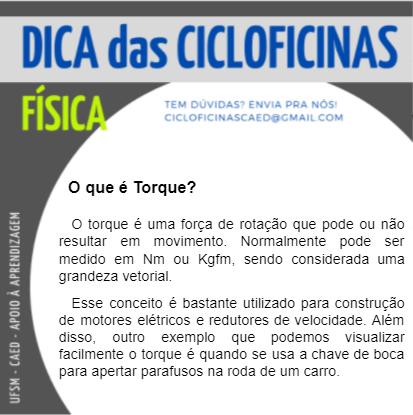 Descrição da imagem: Imagem retangular na horizontal, o fundo é na cor cinza escuro. Na parte superior há um retângulo na cor cinza claro onde tem escrito em letras na cor azul o título “Dica das Cicloficinas”. Abaixo e no lado esquerdo, em letras na cor verde “Física” e do lado em letras pequenas e na cor azul “Tem dúvidas? Envia pra nós! cicloficinascaed@gmail.com”. No centro da imagem há um círculo na cor branca e dentro dele, em letras na cor preta “O que é Torque?” e abaixo o texto “O torque é uma força de rotação que pode ou não resultar em movimento. Normalmente pode ser medido em Nm ou Kgfm, sendo considerada uma grandeza vetorial. Esse conceito é bastante utilizado para construção de motores elétricos e redutores de velocidade. Além disso, outro exemplo que podemos visualizar facilmente o torque é quando se usa a chave de boca para apertar parafusos na roda de um carro”. Na lateral esquerda inferior da imagem, na vertical, em letras na cor branca há “UFSM – CAED – Apoio à aprendizagem”.