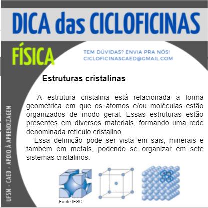 Descrição da imagem: Imagem retangular na horizontal, o fundo é na cor cinza escuro. Na parte superior há um retângulo na cor cinza claro onde tem escrito em letras na cor azul o título “Dica das Cicloficinas”. Abaixo e no lado esquerdo, em letras na cor verde “Física” e do lado em letras pequenas e na cor azul “Tem dúvidas? Envia pra nós! cicloficinascaed@gmail.com”. No centro da imagem há um círculo na cor branca e dentro dele, em letras na cor preta “Estruturas cristalinas” e abaixo o texto “A estrutura cristalina está relacionada a forma geométrica em que os átomos e/ou moléculas estão organizados de modo geral. Essas estruturas estão presentes em diversos materiais, formando uma rede denominada retículo cristalino. Essa definição pode ser vista em sais, minerais e também em metais, podendo se organizar em sete sistemas cristalinos.”. Na lateral esquerda inferior da imagem, na vertical, em letras na cor branca há “UFSM – CAED – Apoio à aprendizagem”.