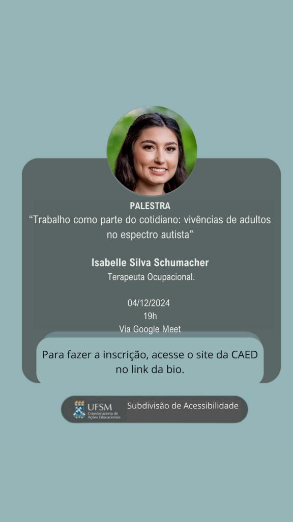 Descrição de imagem: Card com fundo verde água. Centralizado, um quadrado cinza, na parte superior a fotografia de uma mulher. Ela tem pele branca, cabelos e olhos castanho escuros, está sorrindo. Abaixo, dentro do quadro cinza as informações, uma abaixo da outra: “Palestra”, o título do evento – “Trabalho como Parte do Cotidiano: Vivências de Adultos no Espectro Autista”, “Isabelle Silva Schumacher – Terapeuta Ocupacional”,“04/12/2024; 19h e Via Google Meet”. Logo abaixo, dentro de um retângulo verde água, lê-se ”Para fazer a inscrição, acesse o site da CAED no link da bio”. Centralizado, na parte inferior, o brasão da UFSM com “UFSM Coordenadoria de Ações Educacionais” ao lado e à direita “Subdivisão de Acessibilidade”. Fim da descrição.
