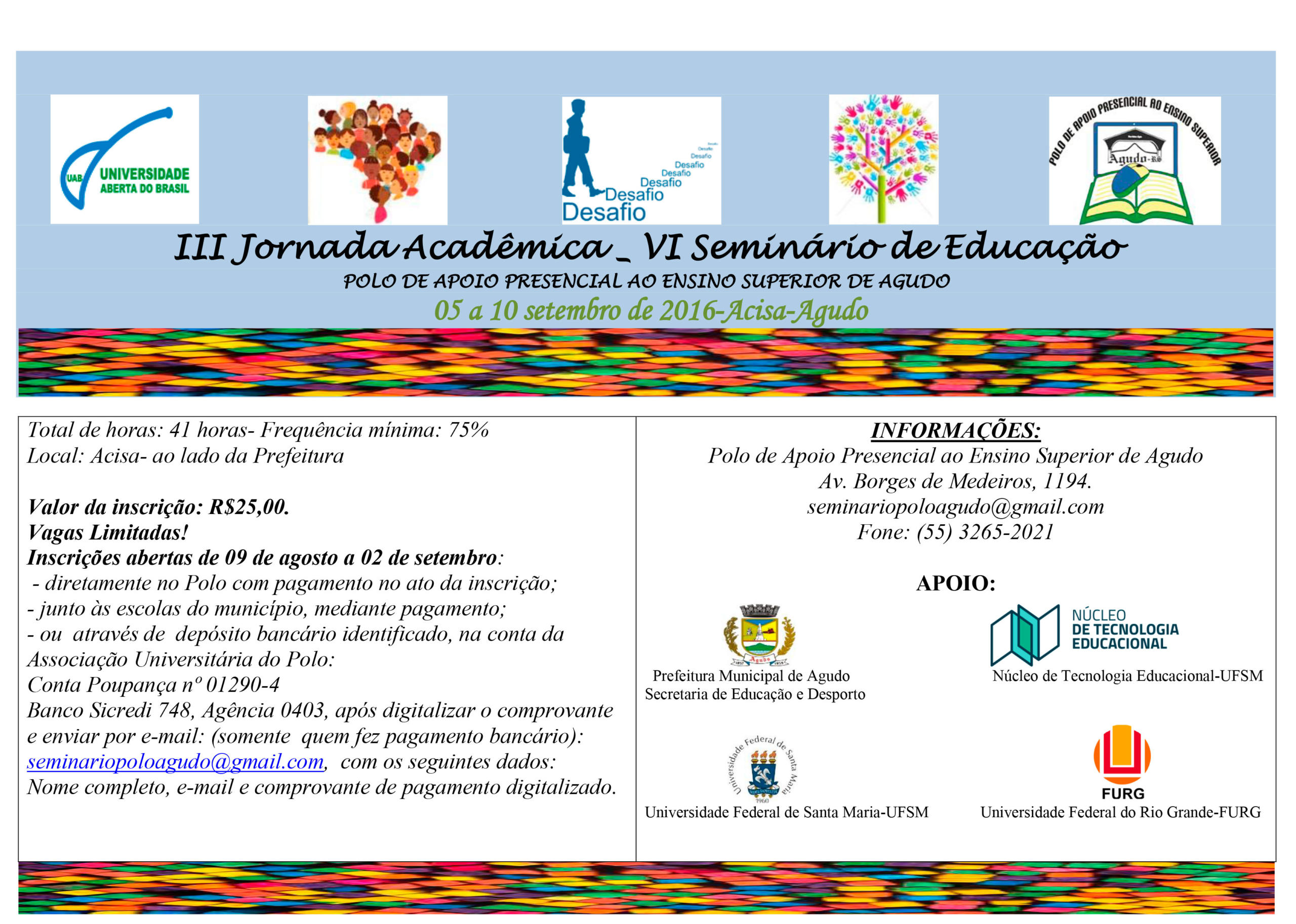 Nos dias 5, 6, 8, 9 e 10 de setembro acontece a III Jornada Acadêmica e VI Seminário de Educação do Polo de Agudo, com o tema “Diversidade na Educação atual”. Os interessados tem até o dia 2 de setembro para realizar inscrição. Mais informações pelo email seminariopolagudo@gmail.com.