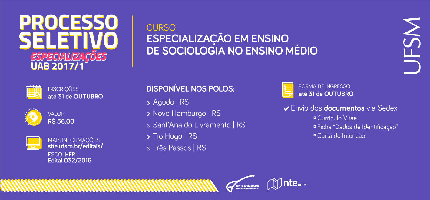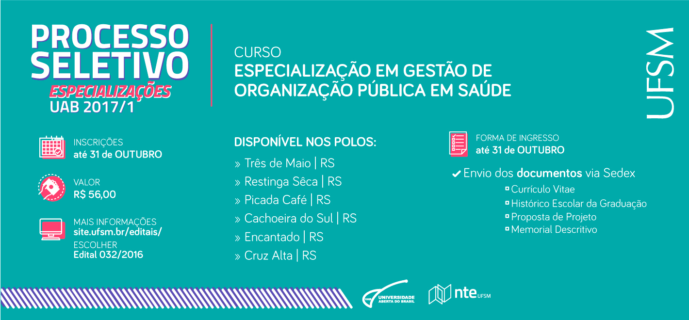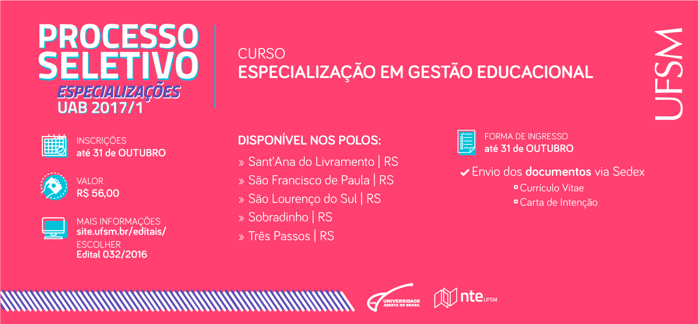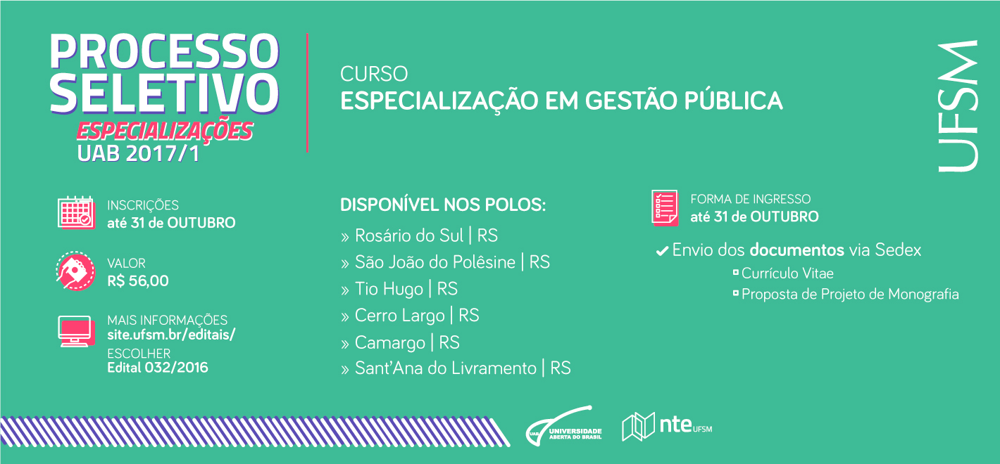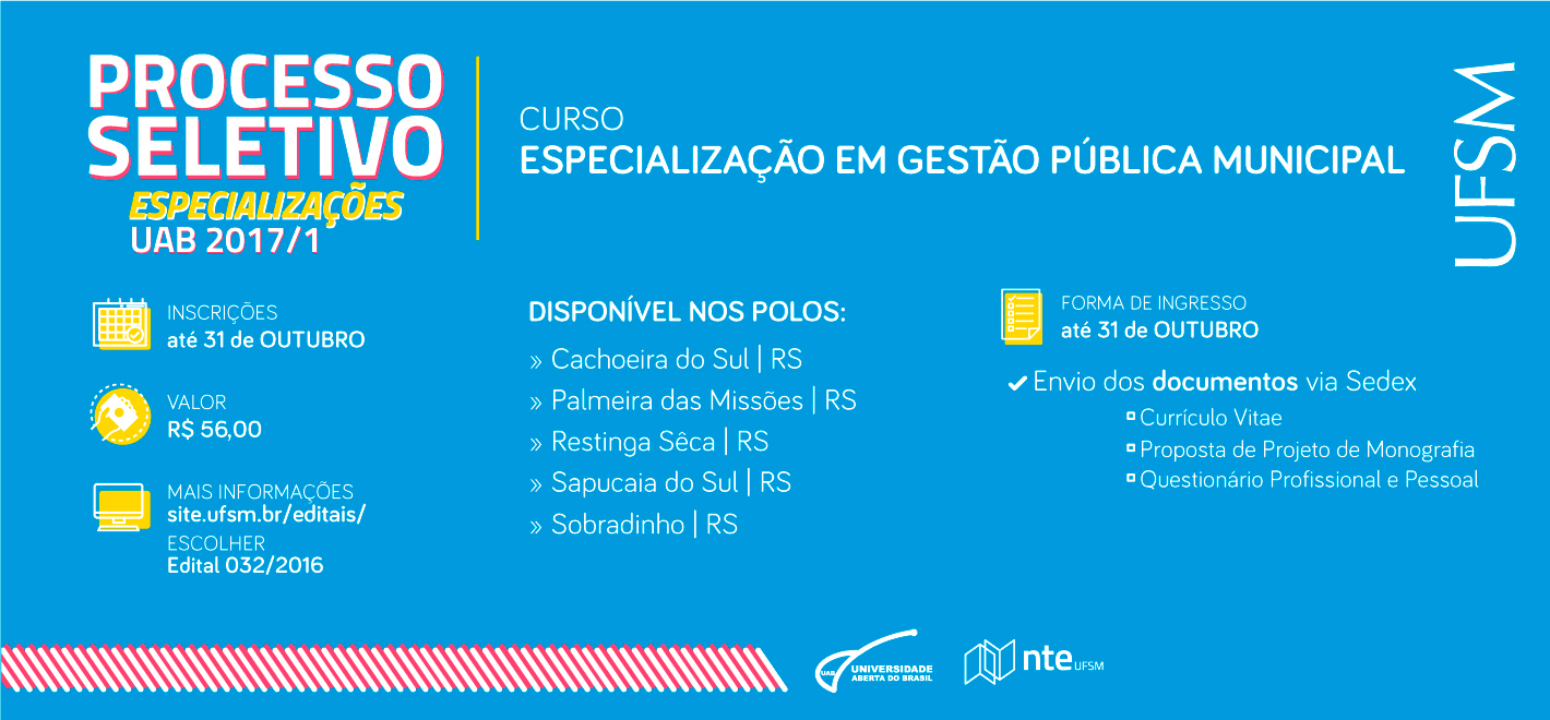 Estão abertas, até às 19h59min de 31 de outubro de 2016, as inscrições via web e postagem dos documentos necessários à avaliação do candidato ao processo seletivo da Pós-graduação, nível de Especialização, modalidade a distância, da Universidade Aberta do Brasil – UAB, para ingresso no primeiro semestre de 2017.