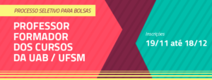 Estão abertas as inscrições para a seleção de professores bolsistas formadores para atuação em cursos ofertados pela UFSM na modalidade EaD, no âmbito da UAB. O Professor Formador é o responsável pelas disciplinas do curso EaD e deve estar à disposição para esclarecimento de dúvidas dos estudantes e tutores.